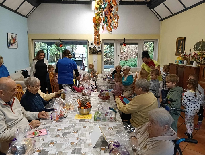 Na przełomie października i listopada zostały zorganizowane w naszym przedszkolu dwie akcje: konkurs plastyczny "Kartka dla Seniora" oraz zbiórka "Mały gest, wielka radość - ciasteczko i herbatka dla starszej pani i starszego pana". Dziękujemy rodzicom zarówno w zaangażowanie swoich dzieci do udziału w konkursie, jak również za wsparcie realizowanej zbiórki. Wszystko to związane było z przypadającym na dzień 14 listopada Ogólnopolskim Dniem Seniora. Finałem obu tych przedsięwzięć było spotkanie reprezentacji naszego przedszkola w postaci dzieci z grupy Jeżyki z seniorami z pobliskiego Domu Seniora. Dzieci najpierw zaprezentowały przygotowaną przez siebie piosenkę, a w dalszej kolejności wręczyły upominki i kartki. Nie obyło się bez łez wzruszenia i wielu podziękowań składanych przez seniorów.
