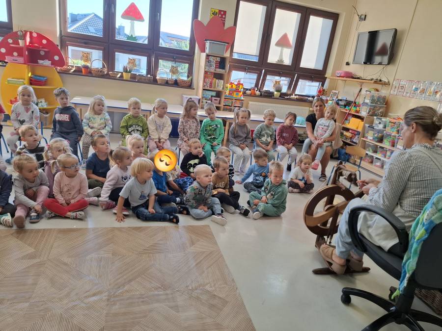 Dnia 2 października odbyły się w naszym przedszkolu warsztaty "Po nitce do kłębka" organizowane przez Zagrodę Powroty. Są to edukacyjne spotkania dla dzieci, które uczą o obróbce wełny od momentu strzyżenia owcy do przędzenia nici. Dzieci poznały życie owiec i baranów, a także mogły pokarmić je marchewką czy pogłaskać.