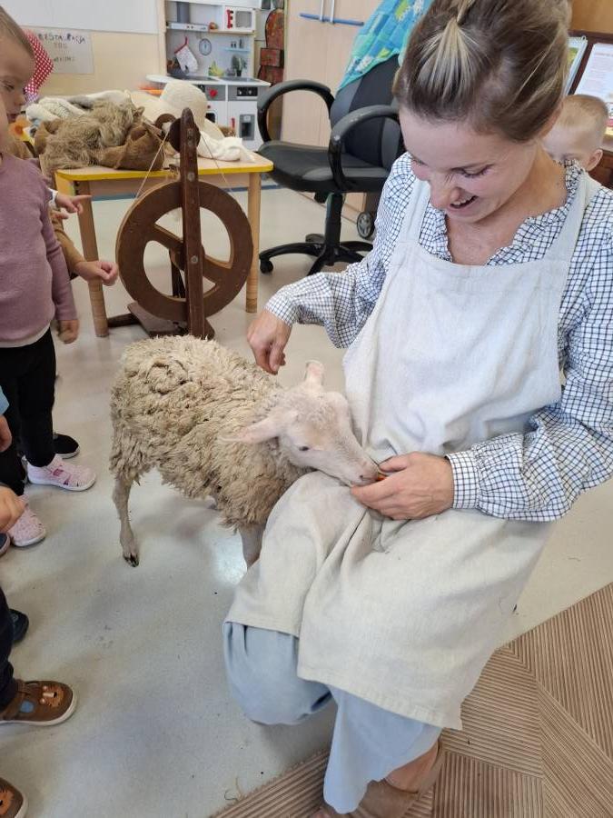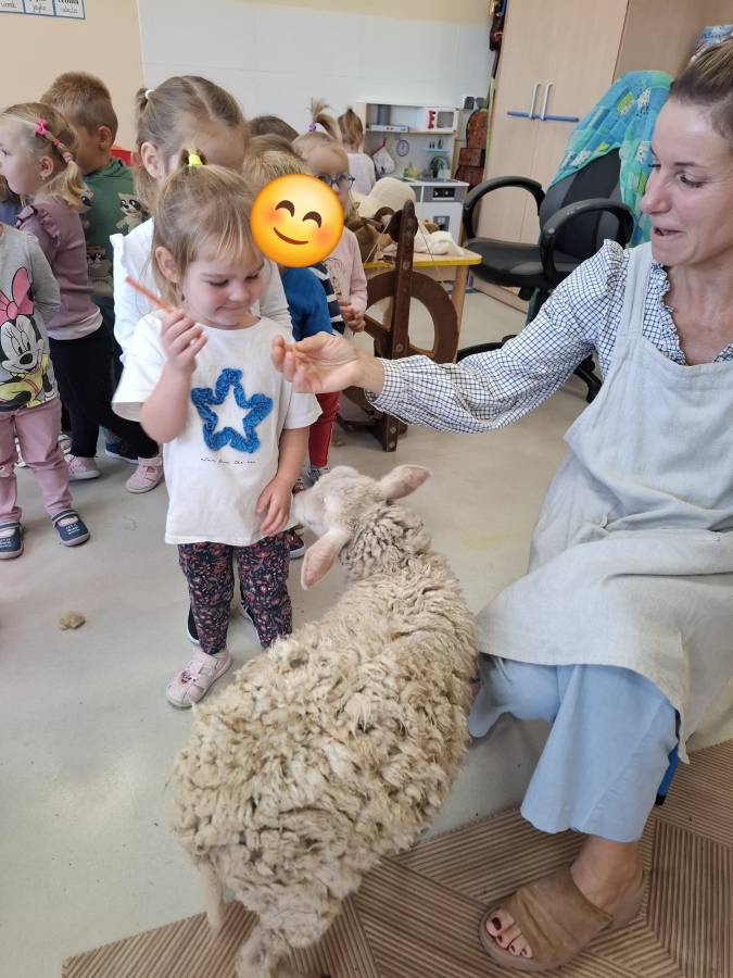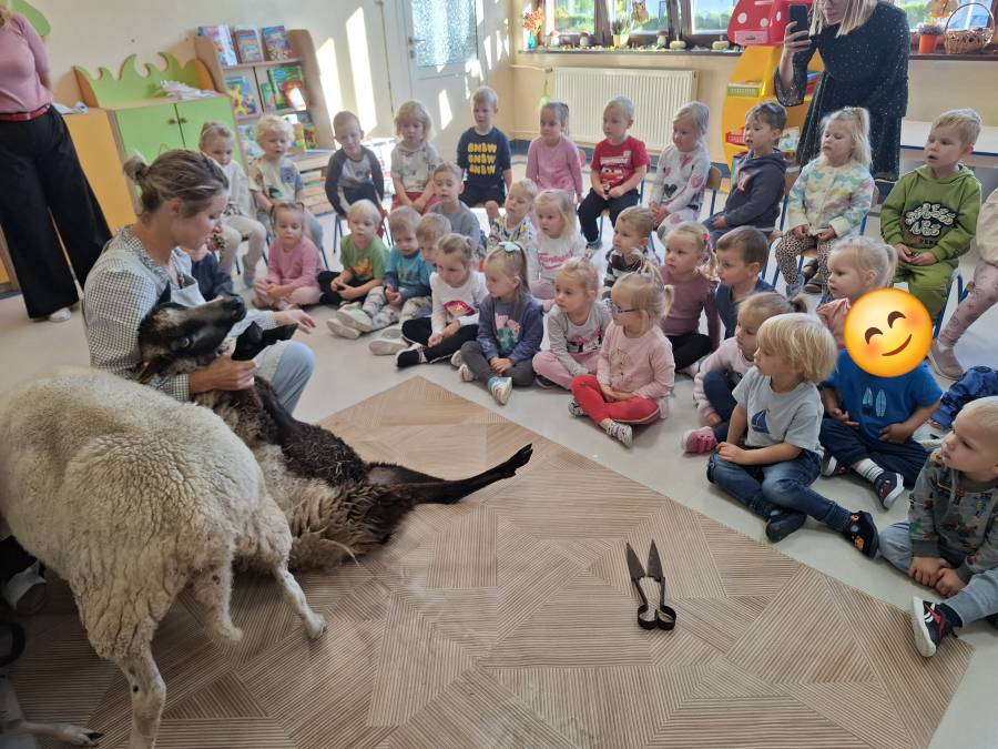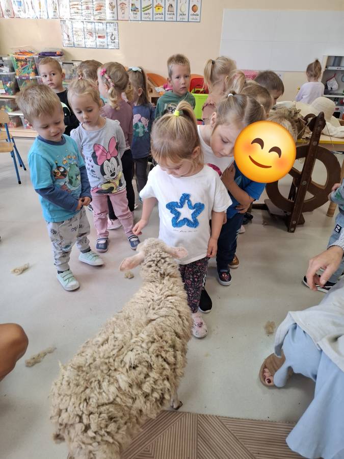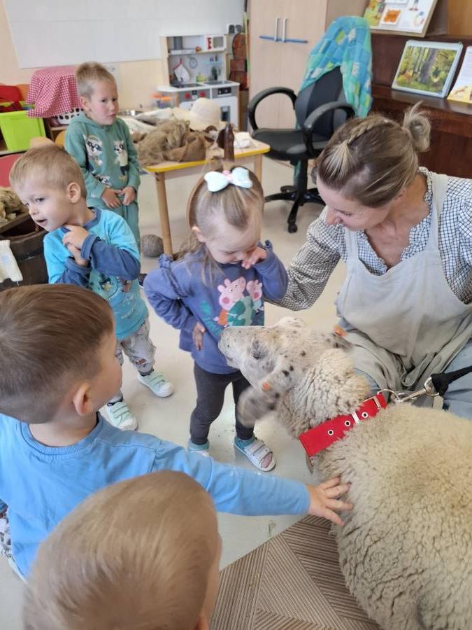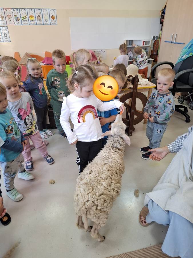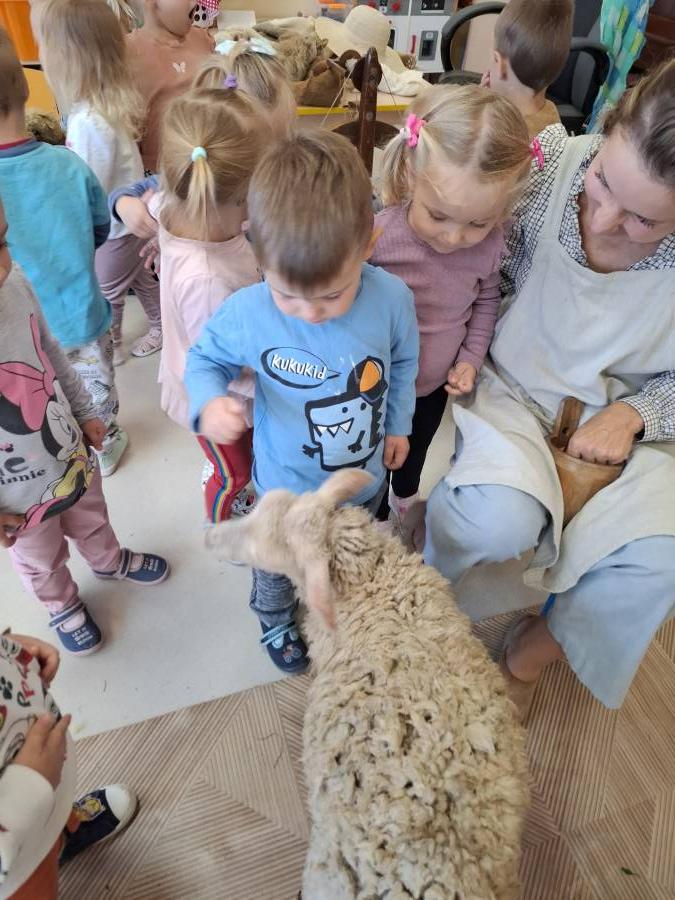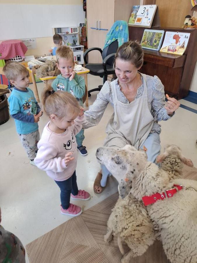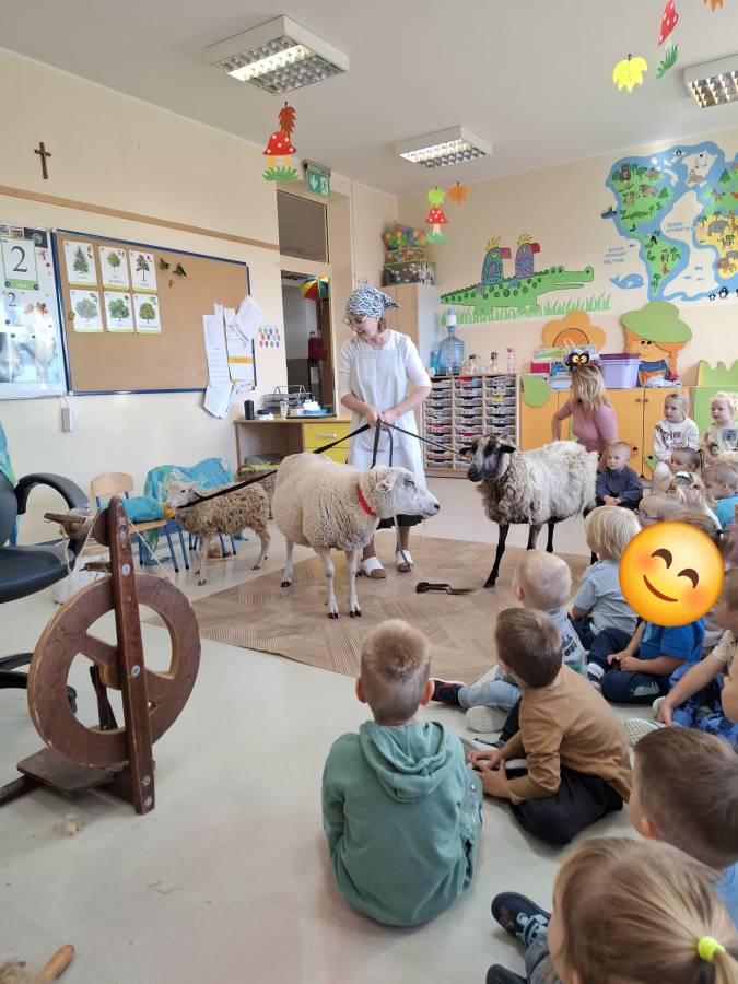 Dnia 2 października odbyły się w naszym przedszkolu warsztaty "Po nitce do kłębka" organizowane przez Zagrodę Powroty. Są to edukacyjne spotkania dla dzieci, które uczą o obróbce wełny od momentu strzyżenia owcy do przędzenia nici. Dzieci poznały życie owiec i baranów, a także mogły pokarmić je marchewką czy pogłaskać.