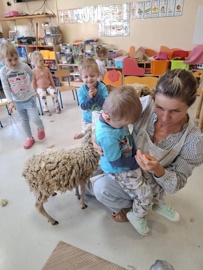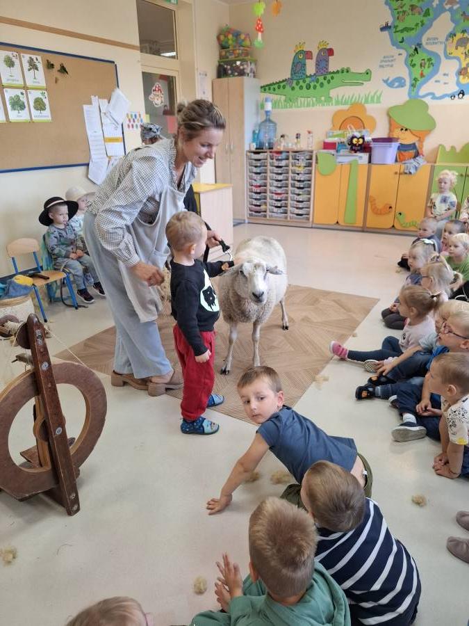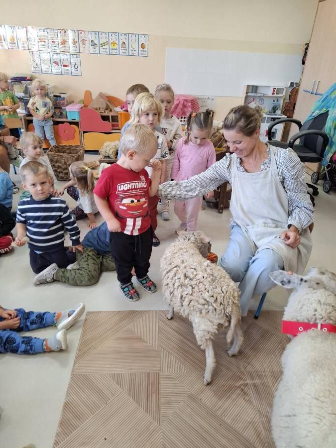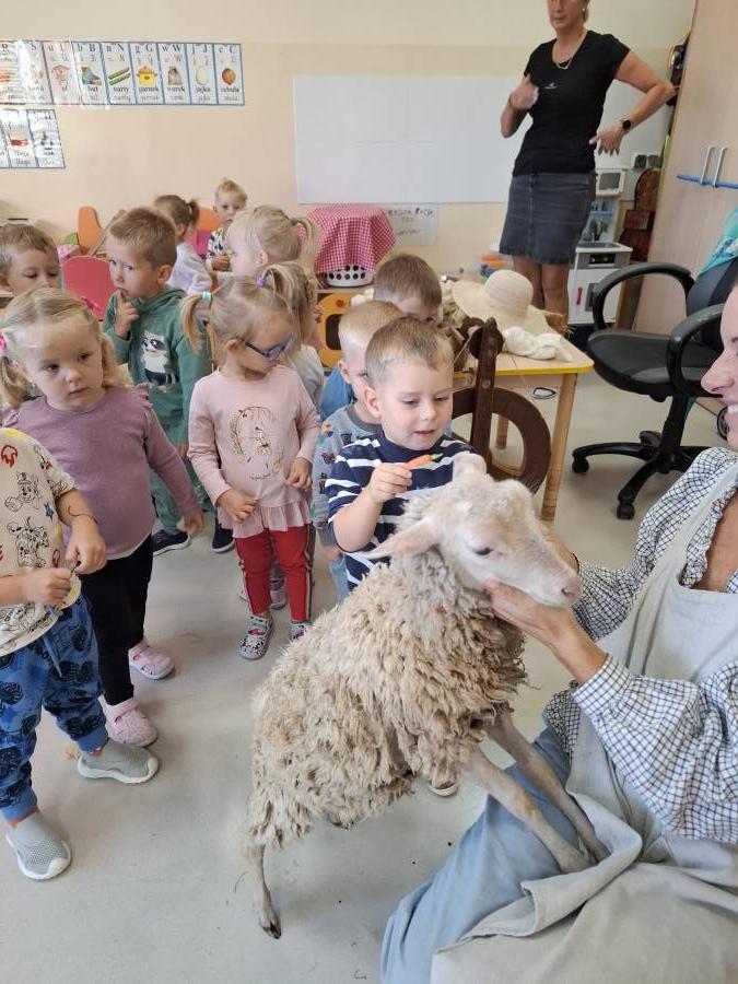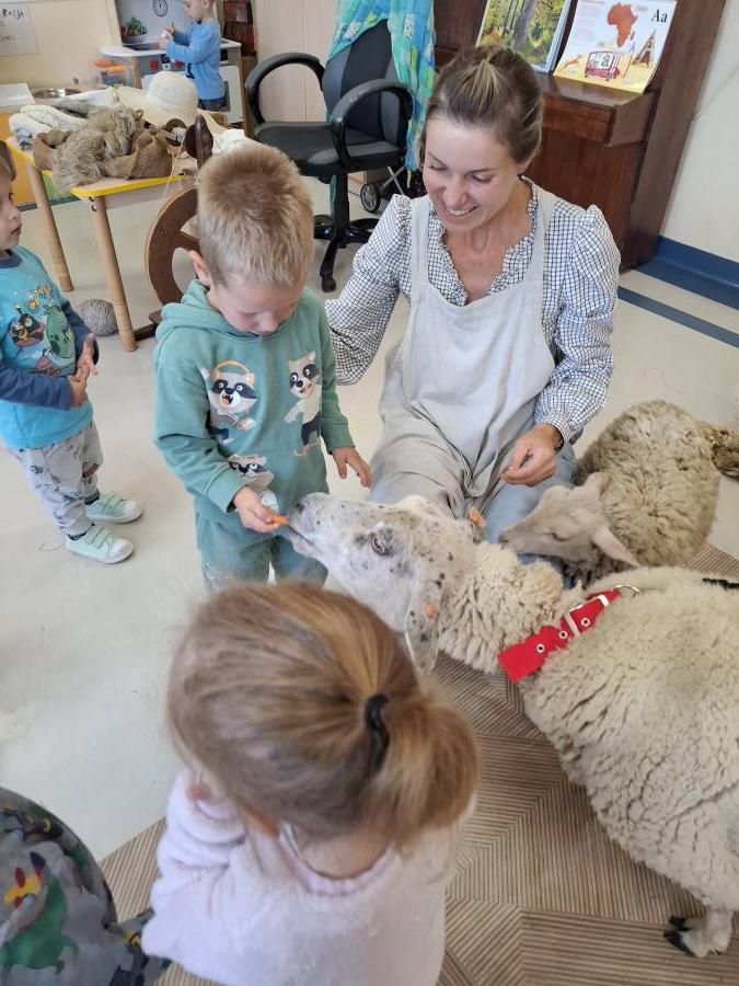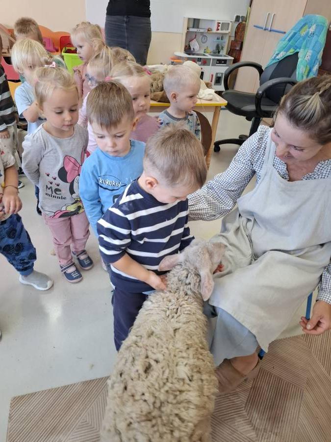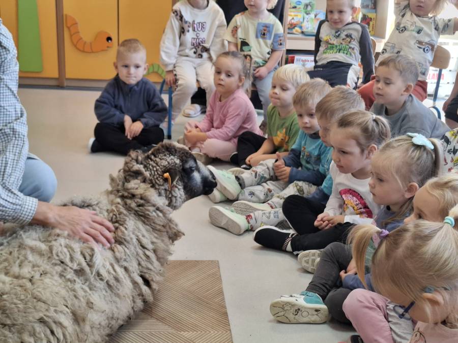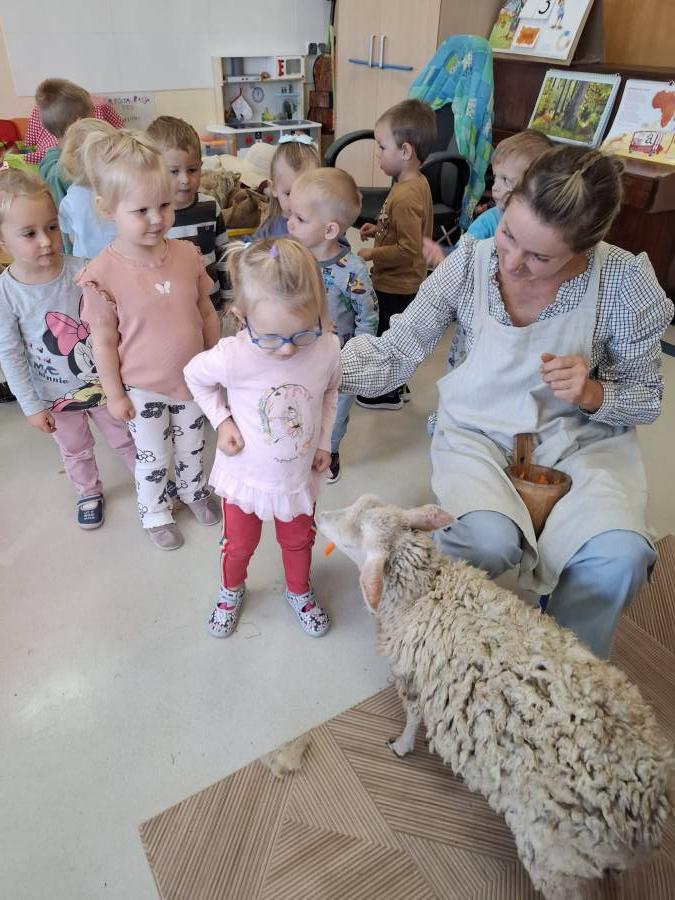 Dnia 2 października odbyły się w naszym przedszkolu warsztaty "Po nitce do kłębka" organizowane przez Zagrodę Powroty. Są to edukacyjne spotkania dla dzieci, które uczą o obróbce wełny od momentu strzyżenia owcy do przędzenia nici. Dzieci poznały życie owiec i baranów, a także mogły pokarmić je marchewką czy pogłaskać.