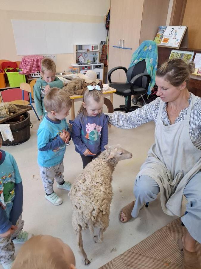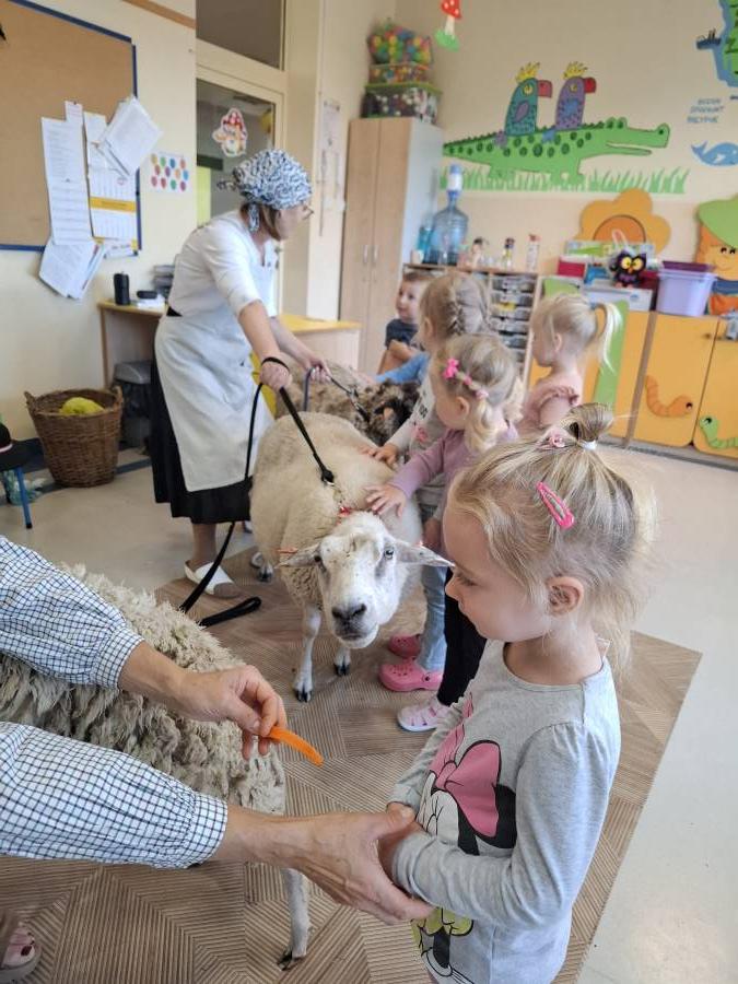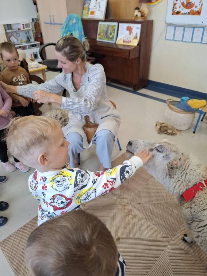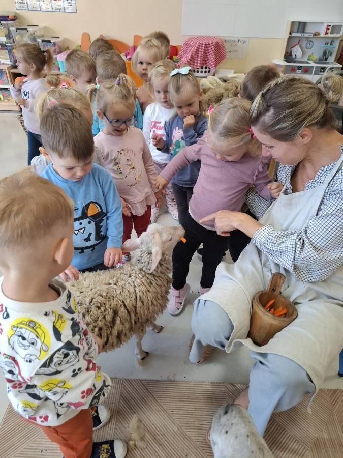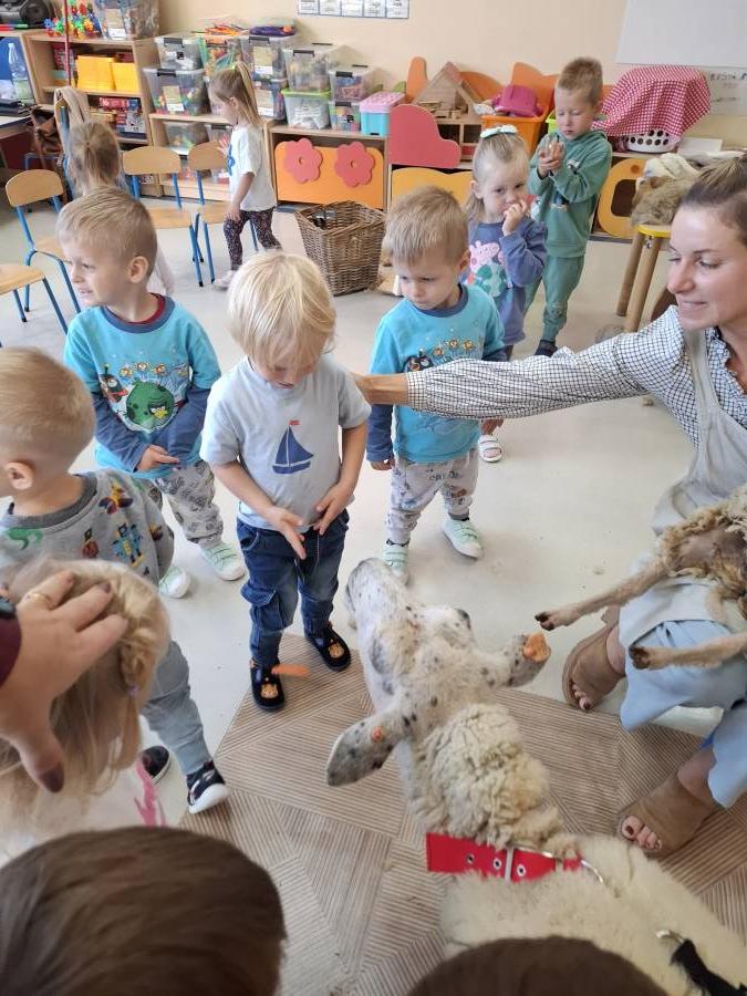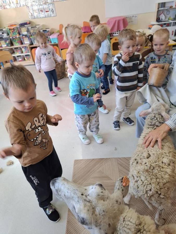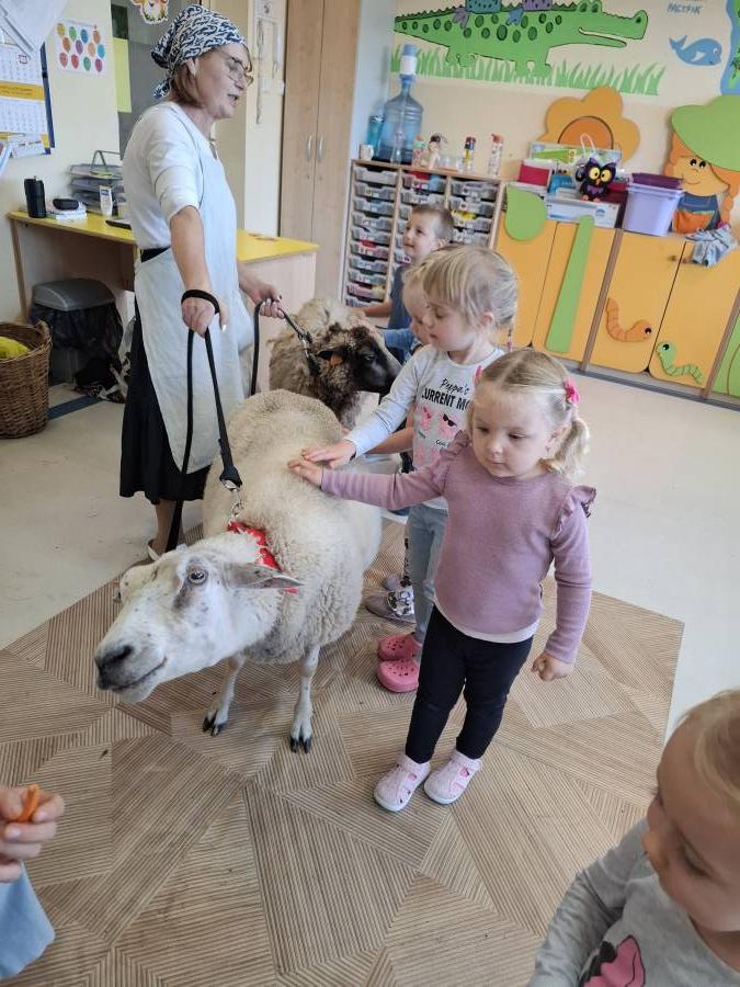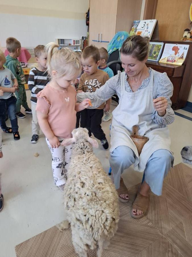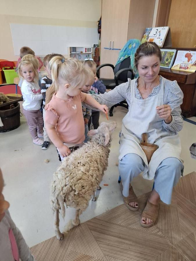 Dnia 2 października odbyły się w naszym przedszkolu warsztaty "Po nitce do kłębka" organizowane przez Zagrodę Powroty. Są to edukacyjne spotkania dla dzieci, które uczą o obróbce wełny od momentu strzyżenia owcy do przędzenia nici. Dzieci poznały życie owiec i baranów, a także mogły pokarmić je marchewką czy pogłaskać.