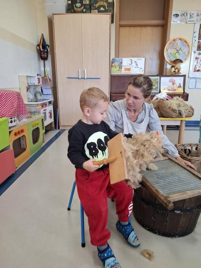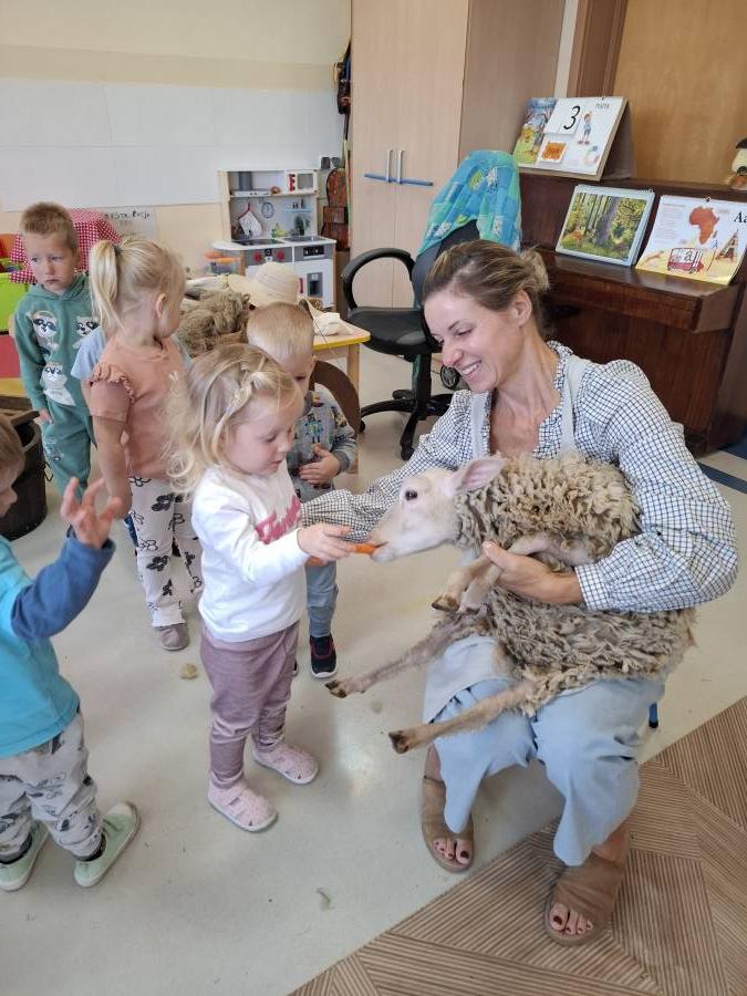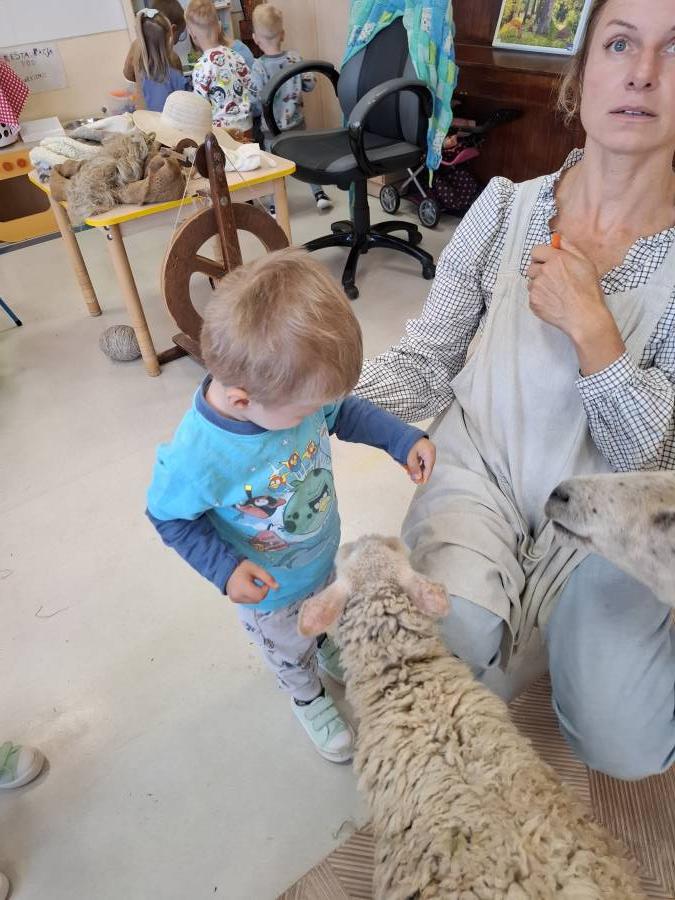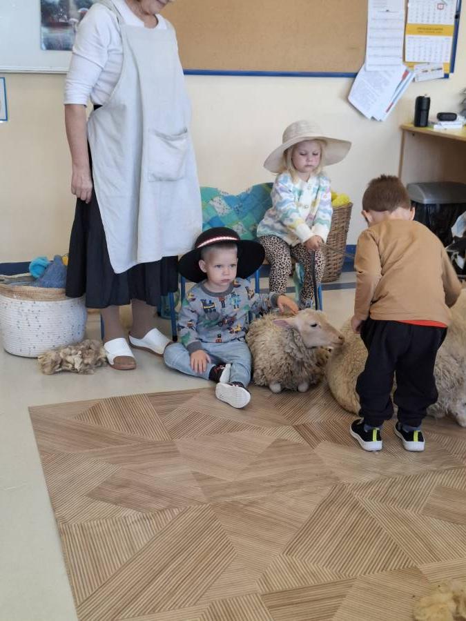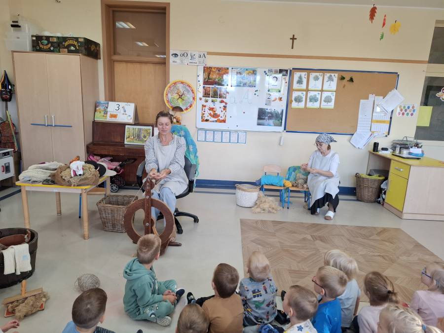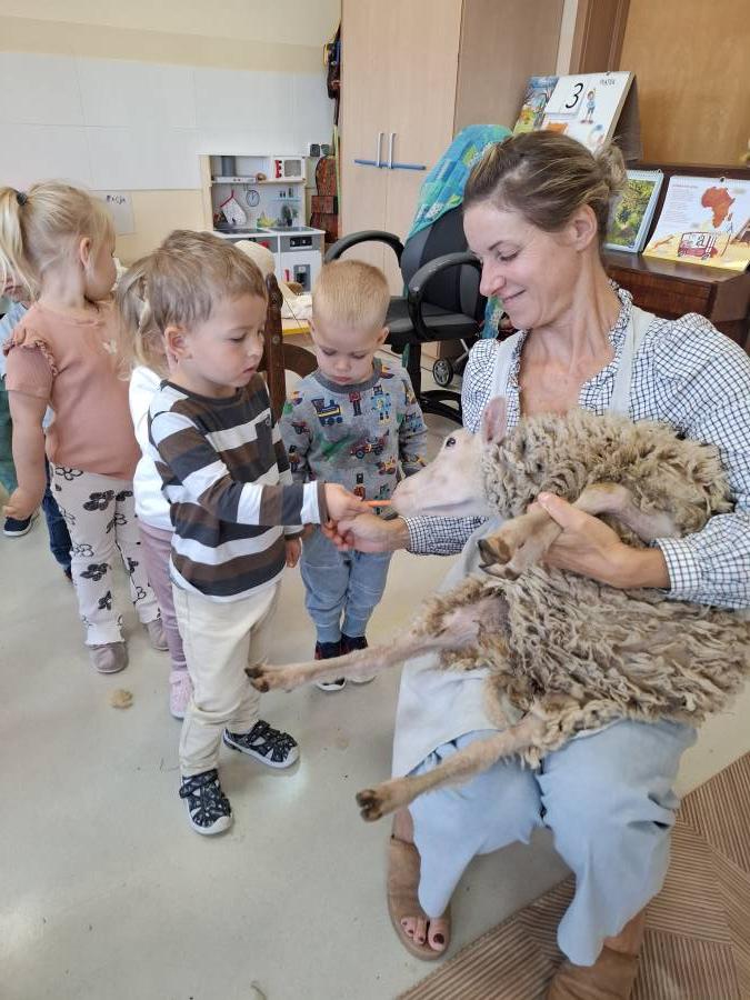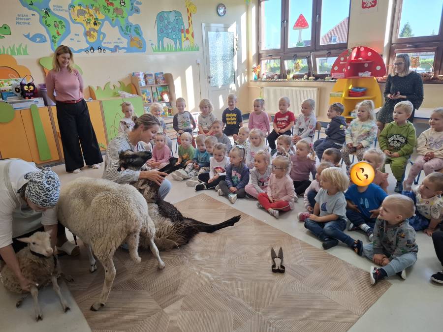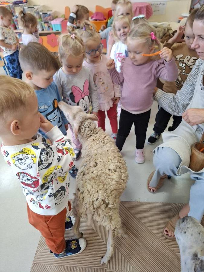 Dnia 2 października odbyły się w naszym przedszkolu warsztaty "Po nitce do kłębka" organizowane przez Zagrodę Powroty. Są to edukacyjne spotkania dla dzieci, które uczą o obróbce wełny od momentu strzyżenia owcy do przędzenia nici. Dzieci poznały życie owiec i baranów, a także mogły pokarmić je marchewką czy pogłaskać.